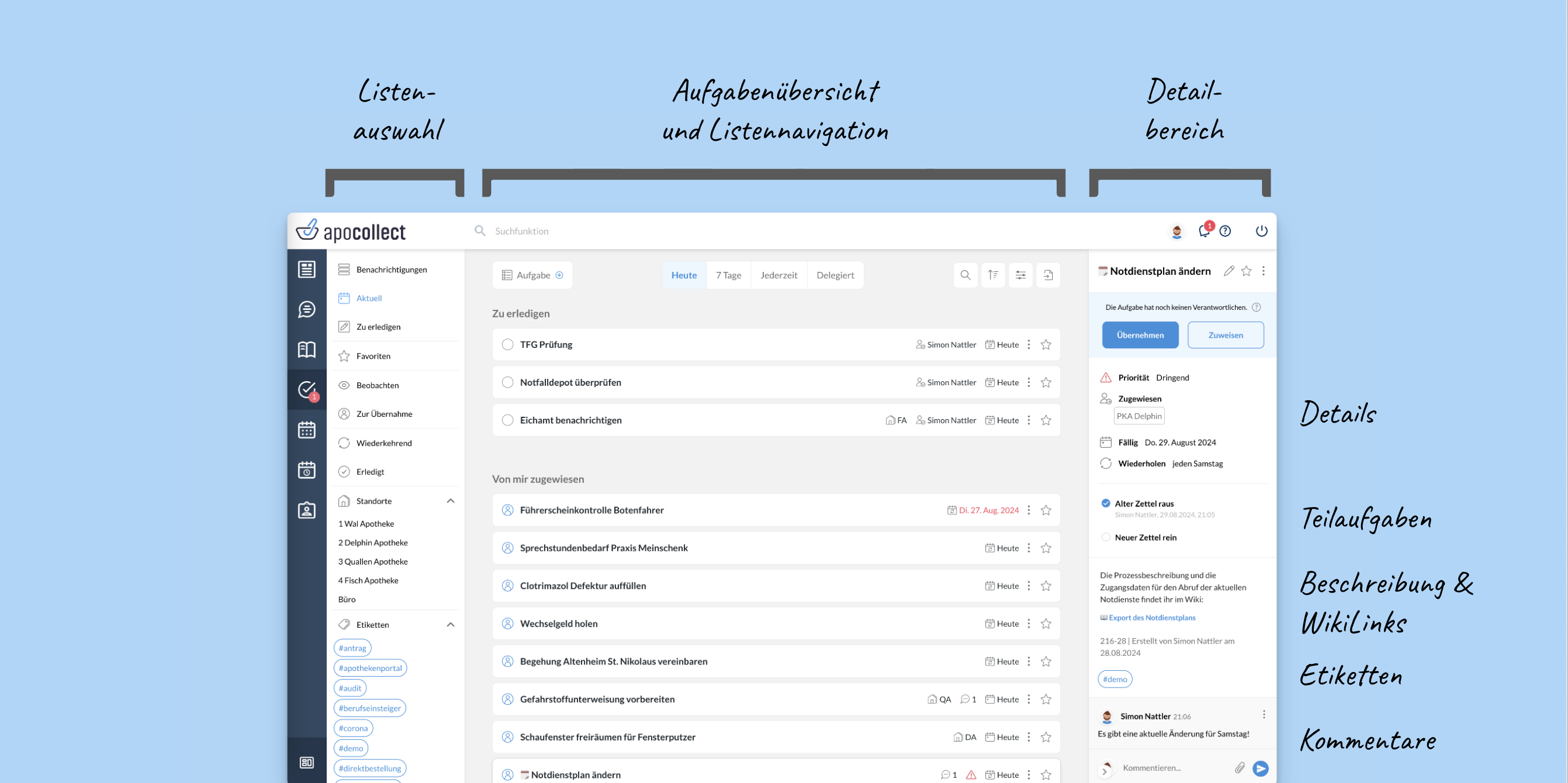 apocollect ordnet eure Aufgaben automatisch in verschiedene Listen ein. Dabei wird berücksichtigt, wann eine Aufgabe fällig ist und wer sie erledigen muss. Ihr habt daher immer alle Aufgaben im Blick, die für euch gerade wichtig sind, und es gehts verloren.