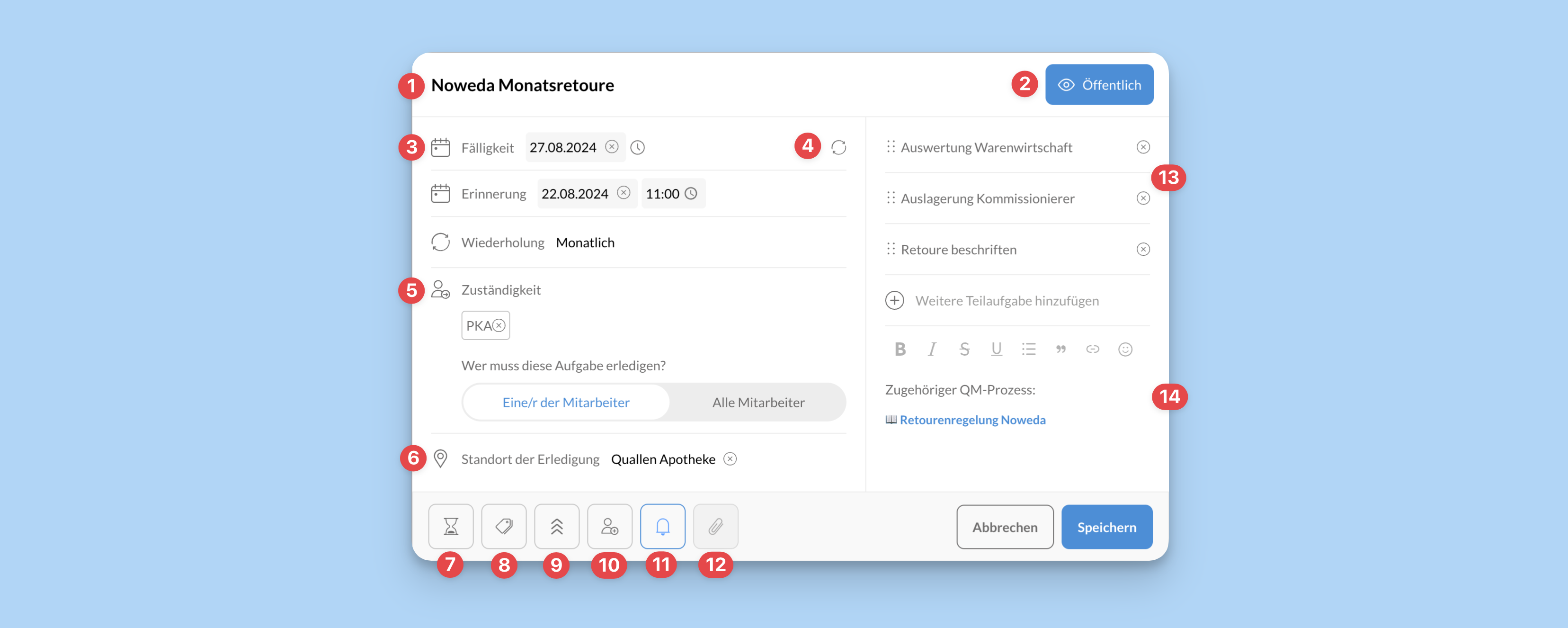 14 | Beschreibungstext + WikiLinks | Füge eine Beschreibung zur Aufgabe an oder verlinke zugehörige Wiki- oder QM-Artikel. |