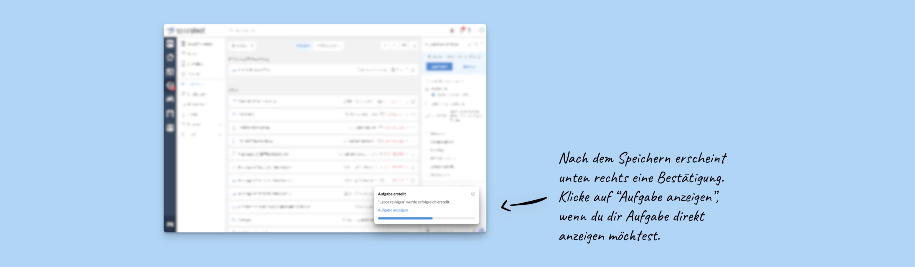 Nach dem Speichern bleibst du in der vorherigen Listenansicht. Unten rechts erscheint für einige Sekunden ein Bestätigungshinweis. Wenn du dir die Aufgabe direkt im Detail wieder aufrufen möchtest, klicke in Hinweis auf „Aufgabe anzeigen“.