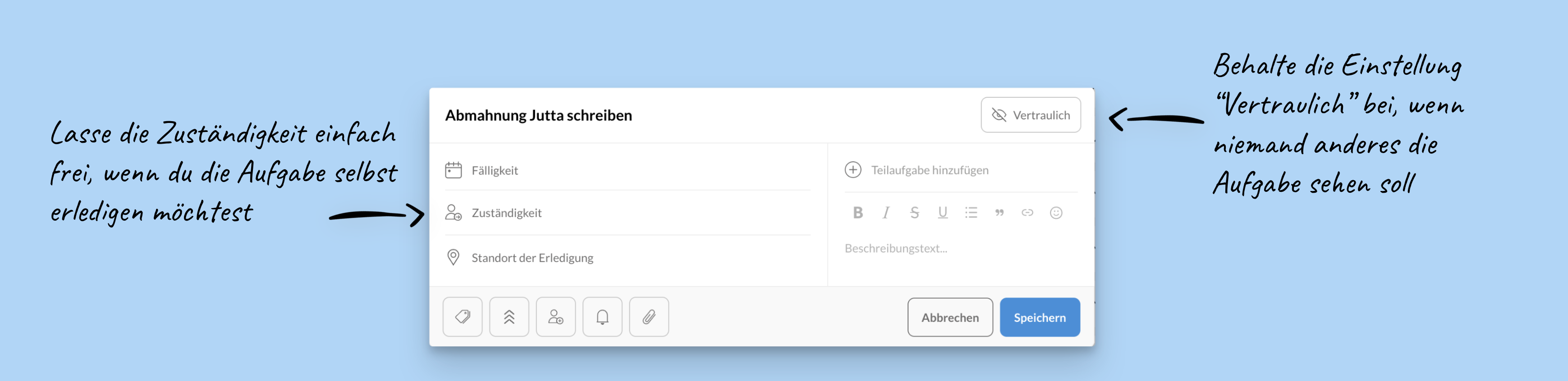 Eine Aufgabe, die ihr mit „vertraulich“ kennzeichnet und bei der ihr keinen Empfänger hinzufügt, könnt nur ihr selbst sehen. Ihr könnt daher auch eure persönlichen Aufgaben über apocollect verwalten und benötigt dafür kein zusätzliches System.