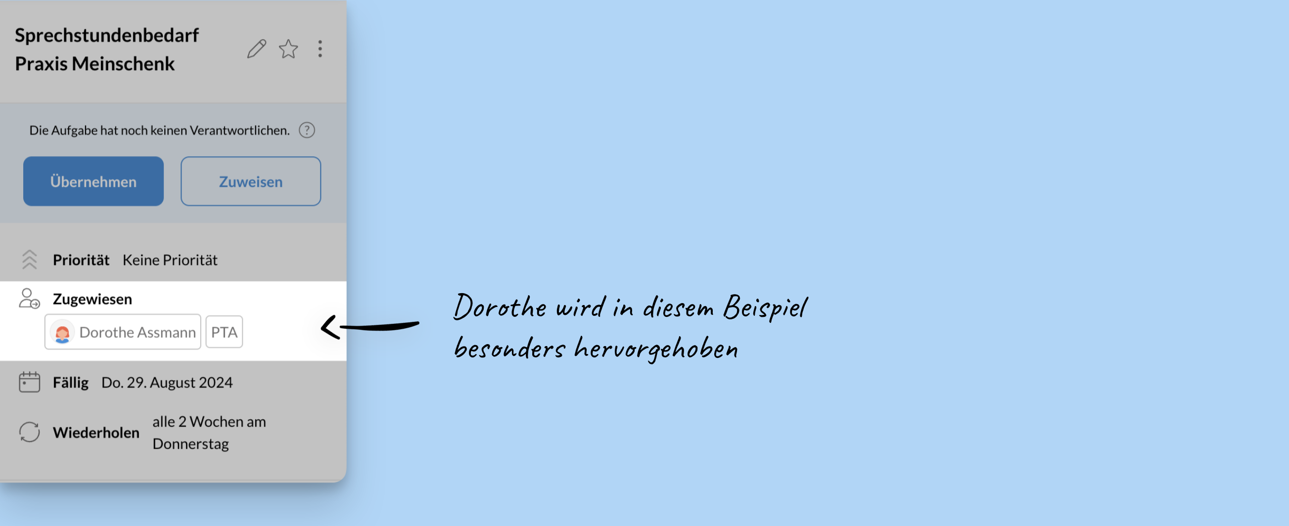 In diesem Fall weist ihr der Aufgabe die ausgewählte PTA zu und zusätzlich die Berufsgruppe PTA. Dadurch wird die Mitarbeiterin in der Aufgabe besonders hervorgehoben. Die restlichen PTAs wissen, dass diese Aufgabe im Normalfall von dieser Mitarbeiterin erledigt werden soll, können im Urlaubs- oder Krankheitsfall jedoch einspringen.