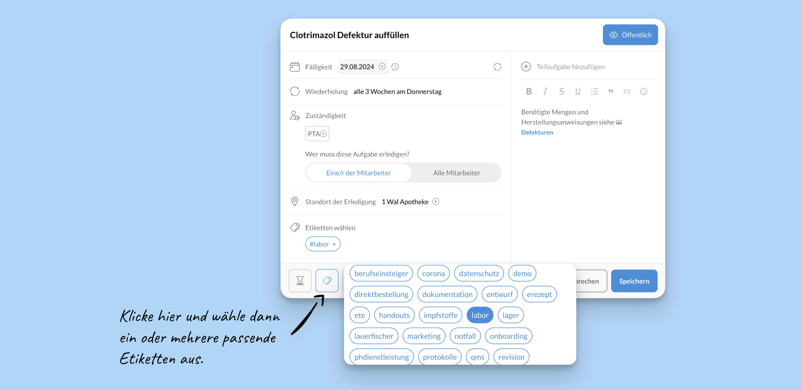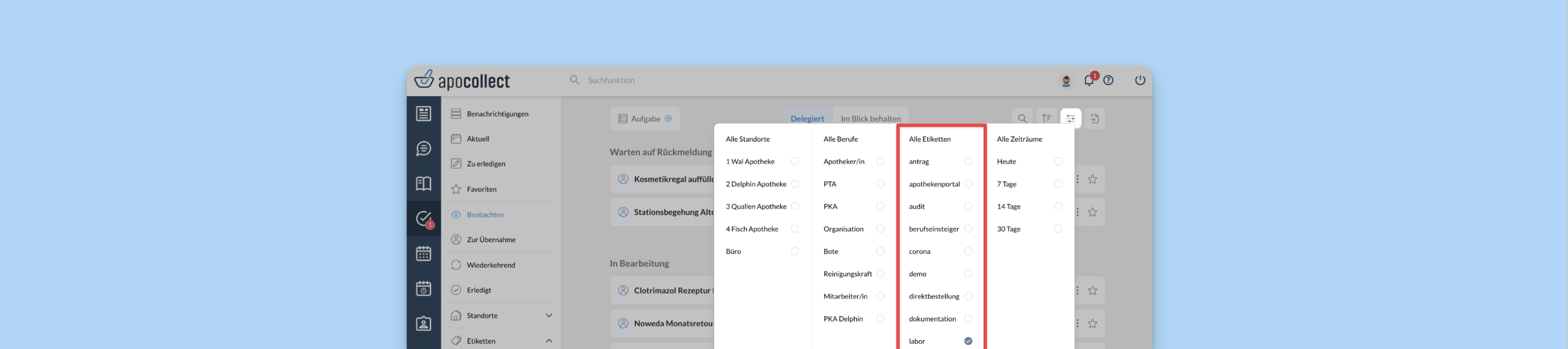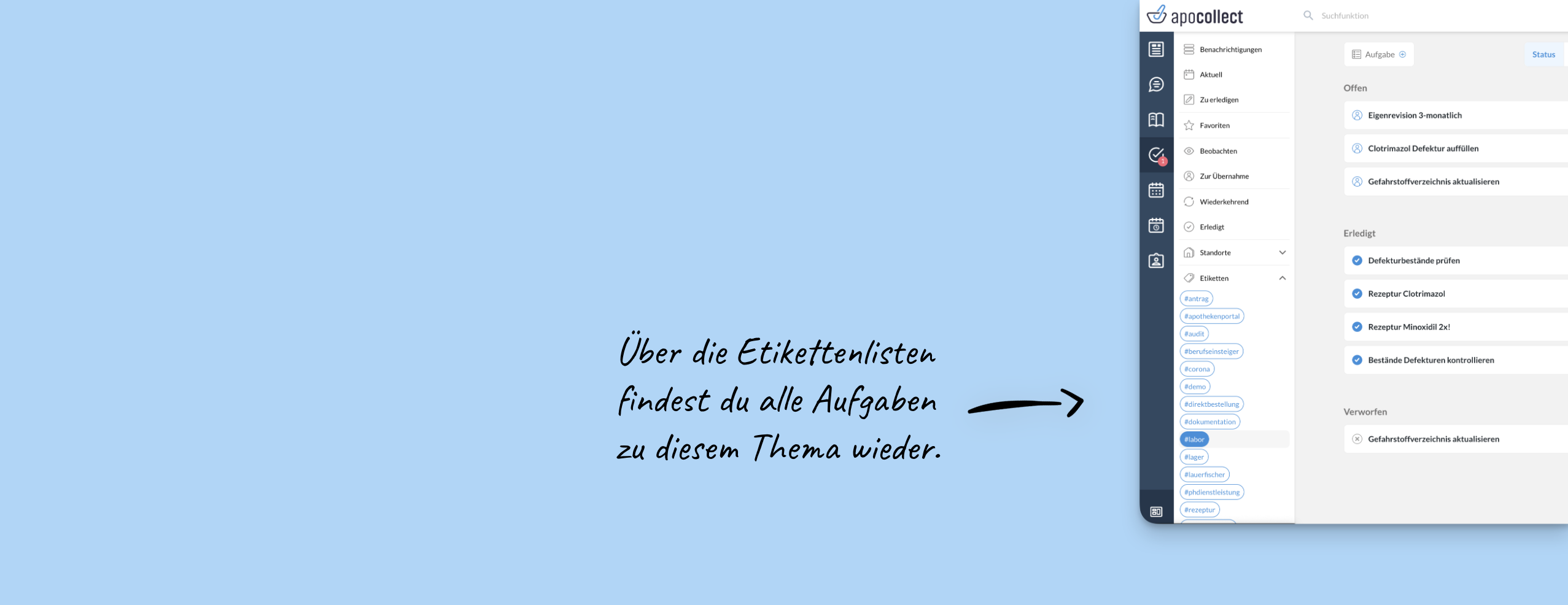 Markiert alle Aufgaben, die im Labor erledigt werden müssen, mit „labor“, z. B. die Herstellung von Rezepturen oder Defekturen. Im Labor könnt ihr dann diese Liste aufrufen und abarbeiten. Ihr seht dann nur diese Aufgaben untereinander, was euch einen genauen Überblick verschafft was noch ansteht.