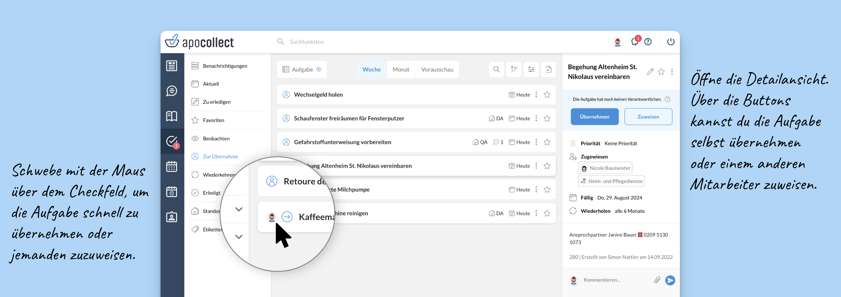 Solange die Aufgabe noch keinen verantwortlichen Mitarbeiter haben, findet ihr die Aufgabe in der Liste „Zur Übernahme“. Aufgaben ohne verantwortlichen Mitarbeiter, die heute fällig sind, werden euch außerdem in der Liste „Aktuell“ angezeigt.