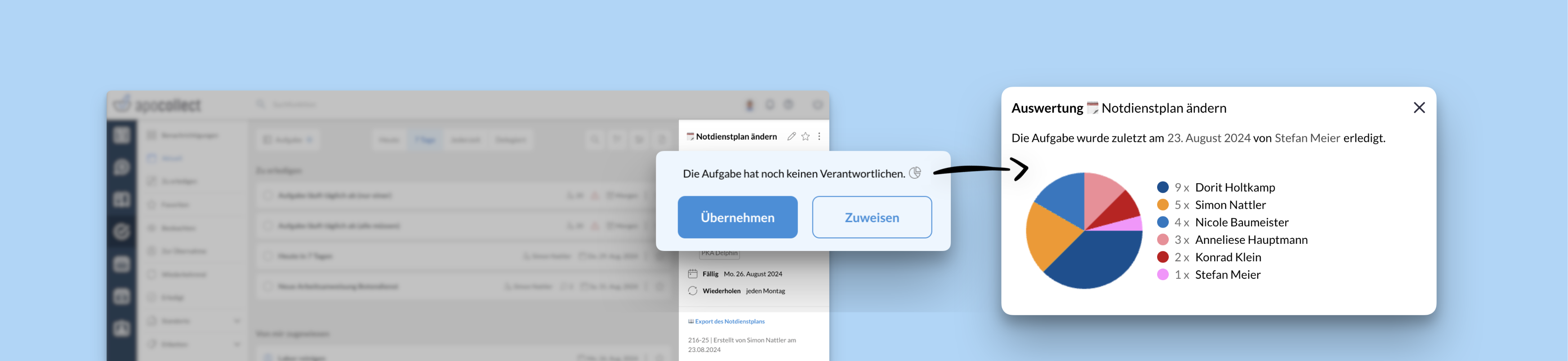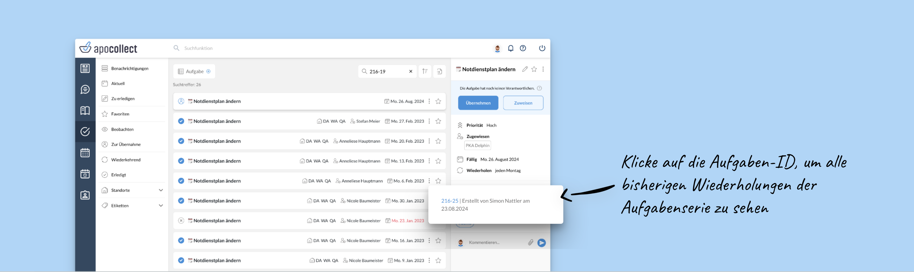 Bei Serienaufgaben, die sich automatisch wiederholen, könnt ihr euch einen schnellen Überblick verschaffen über alle bisherigen Wiederholungen. Ihr könnt euch auch eine Statistik darüber anzeigen lassen, wie häufig die Aufgabe von verschiedenen Mitarbeitern erledigt wurde.