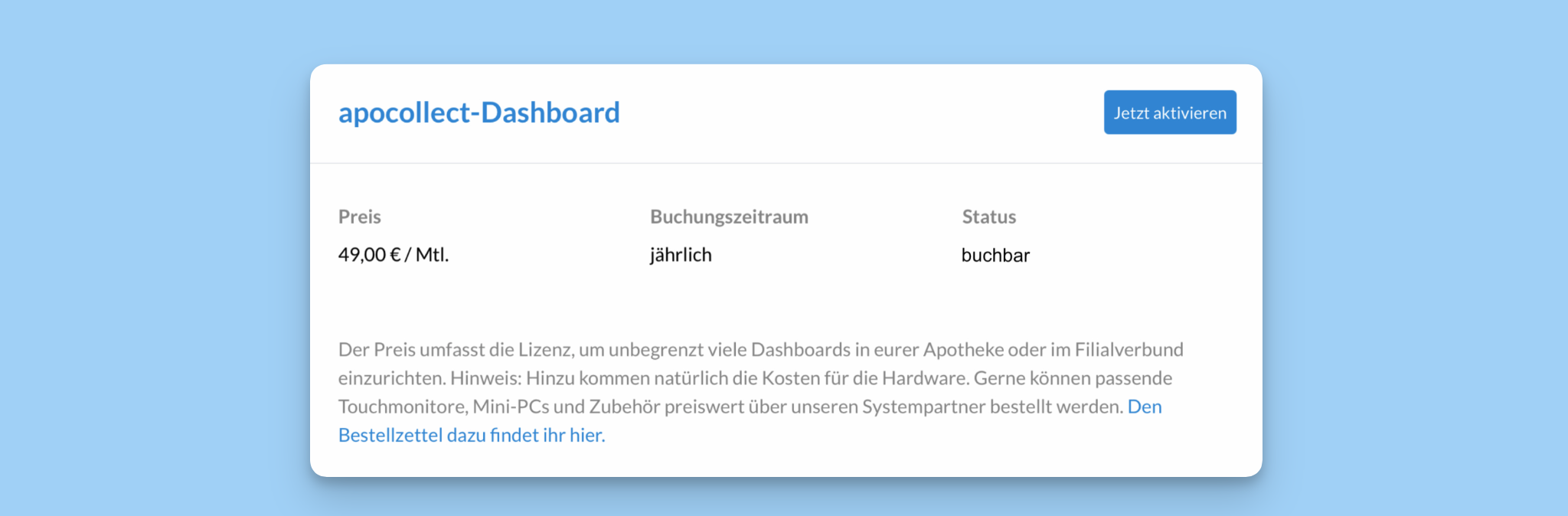 Die Dashboard-Lizenz kostet 588€/Jahr, das entspricht einer monatlichen Gebühr von 49€. Die Anzahl der Monitore oder Filialen ist dabei nicht begrenzt. Für zusätzliche Filialen oder Monitore erhöht sich die Gebühr daher nicht.
