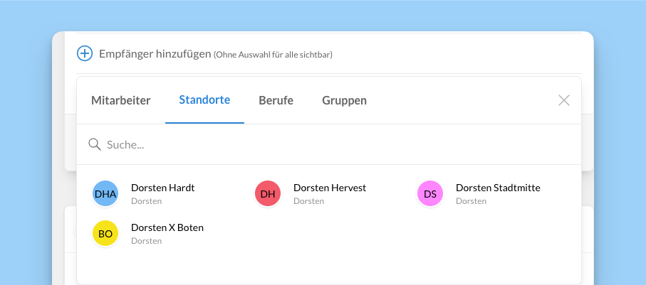 Du kannst bequem einen Standort als Empfänger auswählen. So kann ein Beitrag auch nur an die Mitarbeiter von Filiale 1 geschrieben werden, wenn dieser für Filiale 2/3/4 keinen Mehrwert hat.