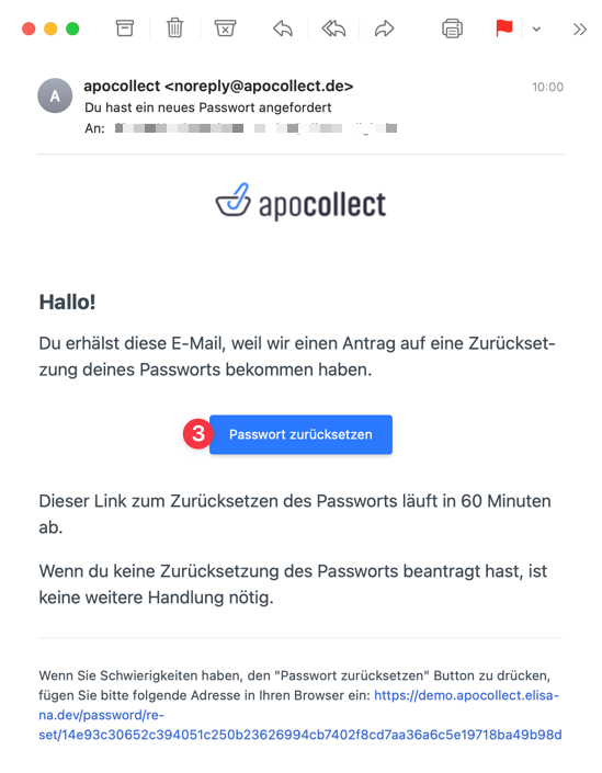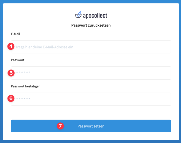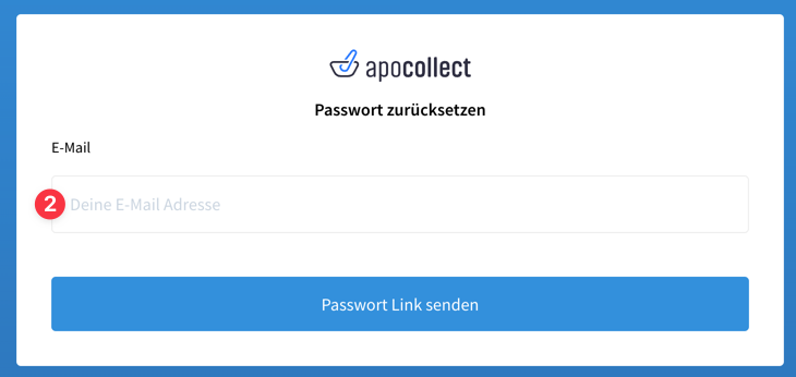 Gib im Formular deine E-Mailadresse ein, über die du bei apocollect registriert bist. Du erhältst per E-Mail einen Link, über den du dir ein neues Passwort vergeben kannst.