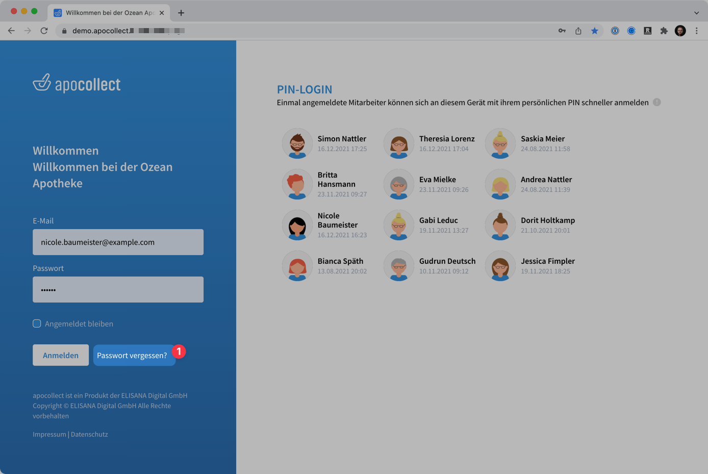 die URL des Apotheken-Arbeitsbereiches (z. B. apothekenname.apocollect.de); wenn diesen nicht kennst frage bitte deine Kolleginnen oder deine/n Chef/in,