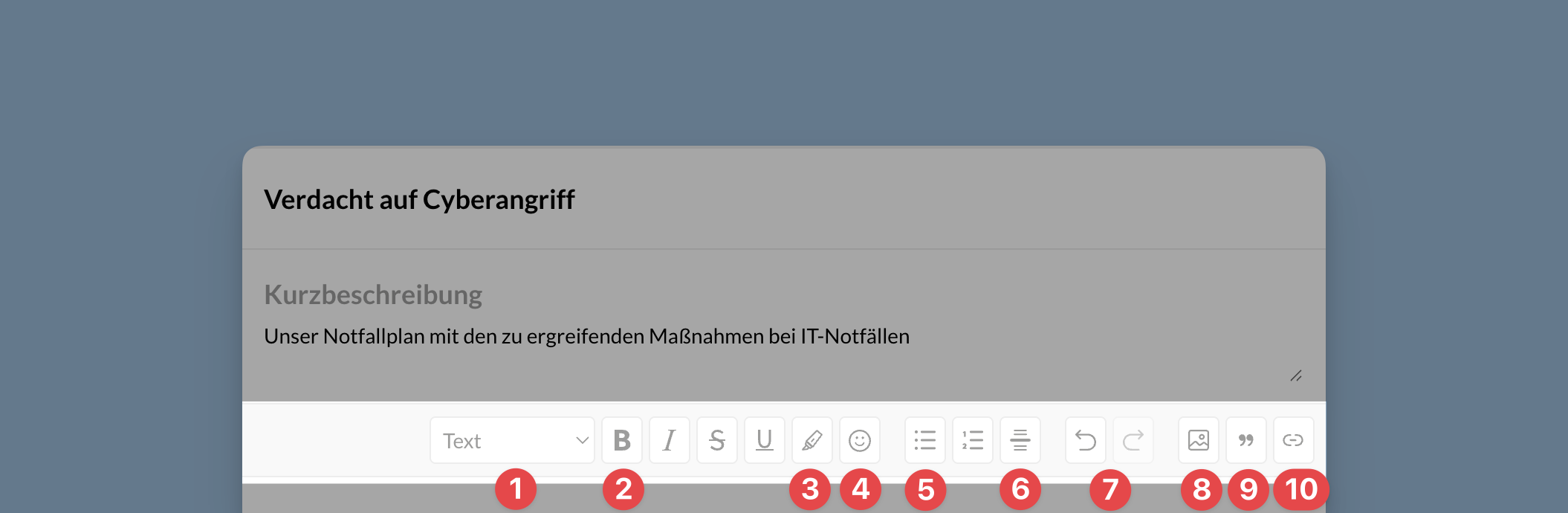 2 | Textformatierung | Formatiert markierten Text fett, kursiv, durchgestrichen oder unterstrichen |