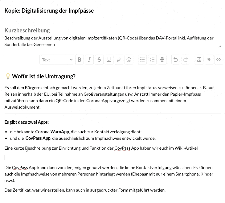 Der Editor funktioniert dabei ähnlich wie ein normales Textdokument – mit dem Vorteil, dass ihr Berechtigungen, Versionierung und Verknüpfungen direkt mit verwalten könnt.