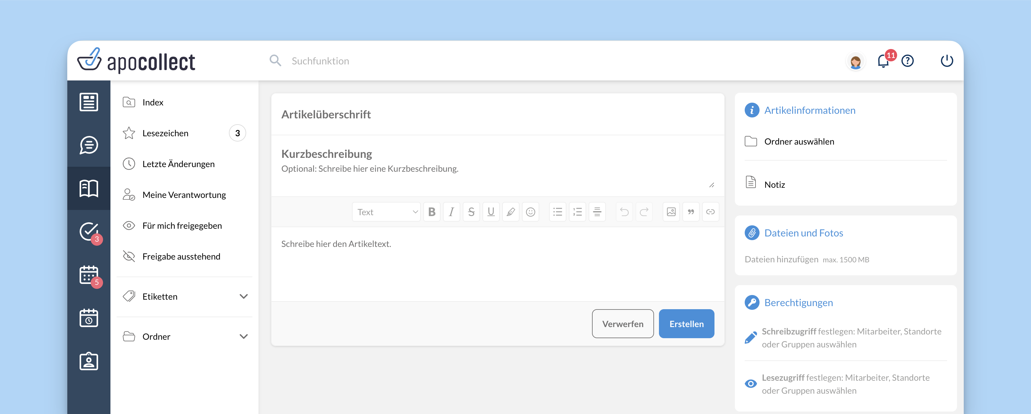 Zugriffssteuerung | Bestimmt, welche Personen oder Gruppen den Artikel lesen oder bearbeiten dürfen. Wenn ihr keine Berechtigungen vergebt, ist der Artikel nur für euch selbst sichtbar. | Alle Mitarbeiter der „Ozean-Apotheke“ haben Lesezugriff, PKAs haben zusätzlich Schreibzugriff |