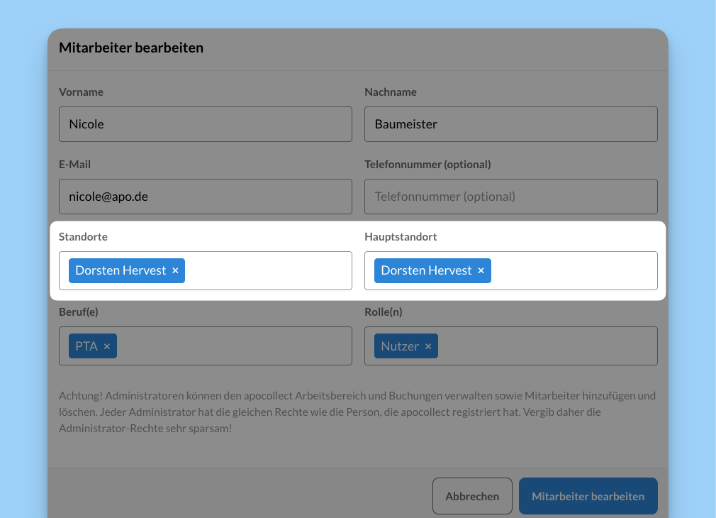 Wenn ihr bereits Mitarbeiter in apocollect eingeladen habt, denkt daran, sie anschließend auch dem passenden Standort zuzuordnen.