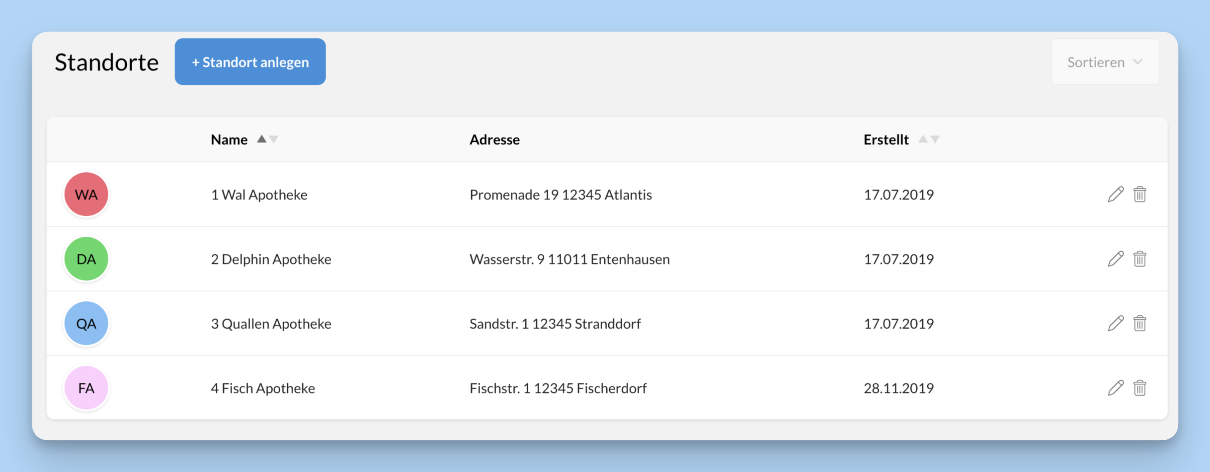 Das Kürzel (z. B. DA für Delphin Apotheke) erscheint später im Standort-Symbol.
