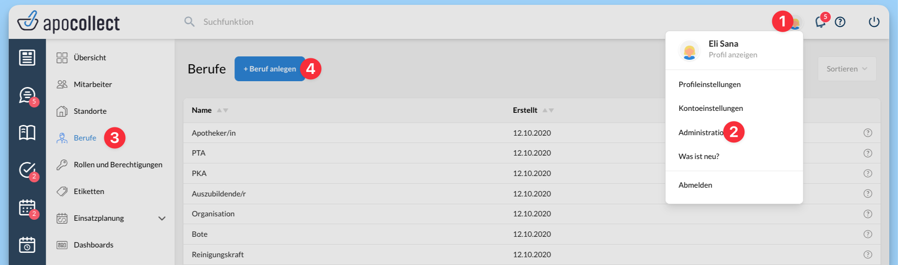 (3) Klicke auf "Beruf anlegen" um einen neuen Beruf hinzuzufügen.