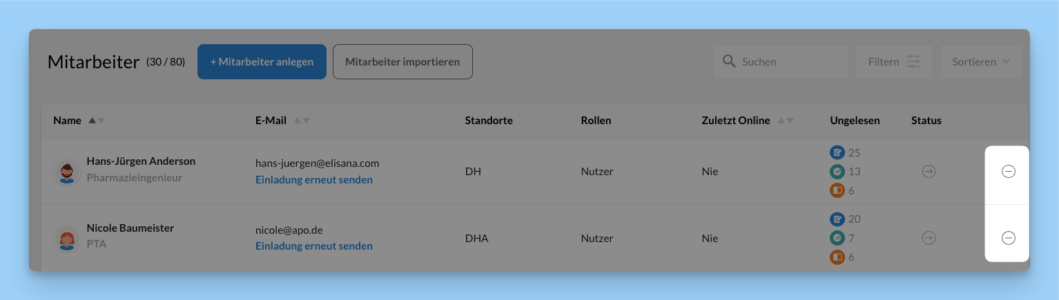 Die Deaktivierung und Löschung von Mitarbeitern kann nur von einem Admin durchgeführt werden.