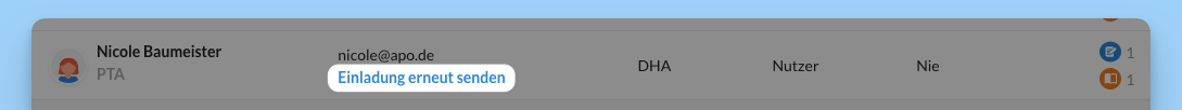 Hat ein Mitarbeiter sich noch nicht aktiviert, kann nach wenigen Minuten erneut eine Email gesendet werden. Dazu erscheint in der Übersicht der Hinweis Einladung erneut senden. Wenn du hierauf klickst, verschickt euer Arbeitsbereich automatisch eine neue Email.