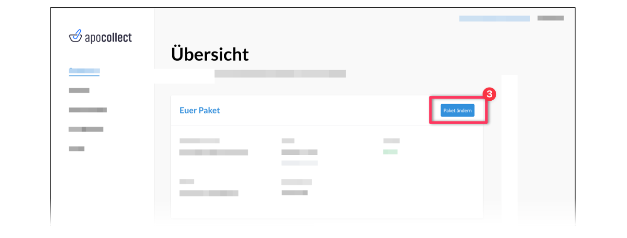 Du befindest dich jetzt in der Verwaltung deines apocollect Arbeitsbereiches. Du siehst hier deine aktuell gebuchte apocollect-Version. Klicke auf den Button Paket ändern (3).