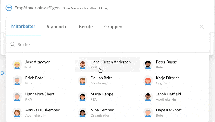 💡 Bei der Empfängerauswahl handelt es sich um eine ODER Beziehung. Mitteilungen, die ihr z. B. an den Standort Delphin-Apotheke und an die Berufsgruppe PKA sendet, erhalten alle Mitarbeiter aus der Delphin-Apotheke + alle PKAs. Ihr habt aber die Möglichkeit, euch z. B. eine Gruppe (oder einen Beruf) PKA Delphin anzulegen, um hier eine schnelle Vorauswahl zu haben.