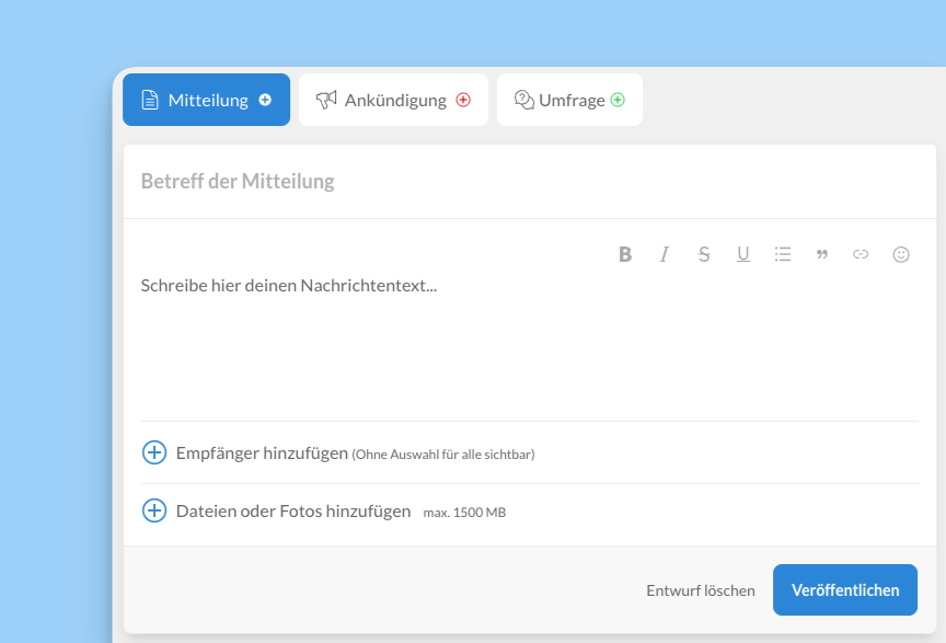 In den Nachrichtentext gehören die eigentlichen Informationen. Ihr seid hier im persönlichen Teambereich, es braucht also keine Anreden oder Grußformeln wie in einer E-Mail. Das macht es übersichtlicher.