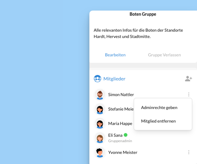 Wenn du einen Gruppenchat erstellt hast, ihn aber nun verlassen möchtest, musst du zunächst einen anderen Gruppenadmin ernennen. Dies machst du ebenfalls in den Chateinstellungen. Gehe hier zum betreffenden Mitarbeiter und wähle "Adminrechte geben".