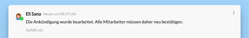 Wenn eine Ankündigung mindestens einmal bestätigt wurde, ist ebenfalls noch eine Änderung möglich. Wichtig: In diesem Fall werden bei einer Änderung alle Bestätigungen wieder herausgenommen, und die Ankündigung muss von allen Empfänger neu bestätigt werden. Ein automatisch erzeugter Kommentar weißt das Team darauf hin. Hierdurch kann niemand etwas bestätigen, das nachträglich noch geändert wird.