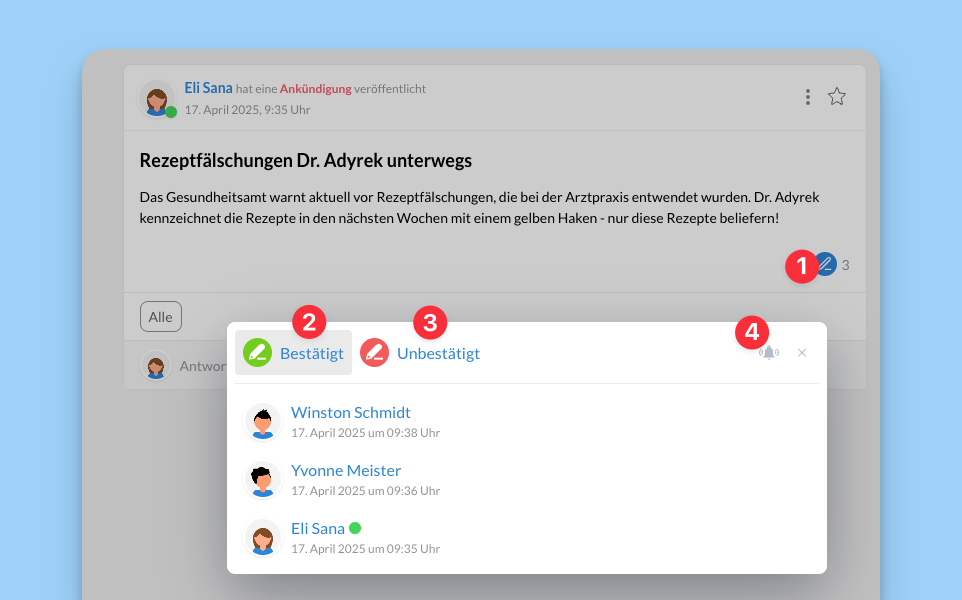 Bei einer eigenen Ankündigung wird dokumentiert, welche Empfänger bereits bestätigt haben und wer noch nicht. Auch die Uhrzeit und das Datum der Bestätigung wird notiert. Dazu kann auch der Admin des Arbeitsbereiches (i. d. R. ist das der/die Inhaber) die erfolgten Bestätigungen sehen.