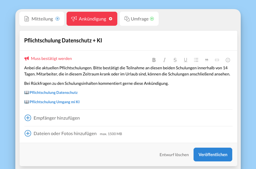 ⚠️ Eine bestätigte Ankündigung kann nicht zurückgenommen werden.