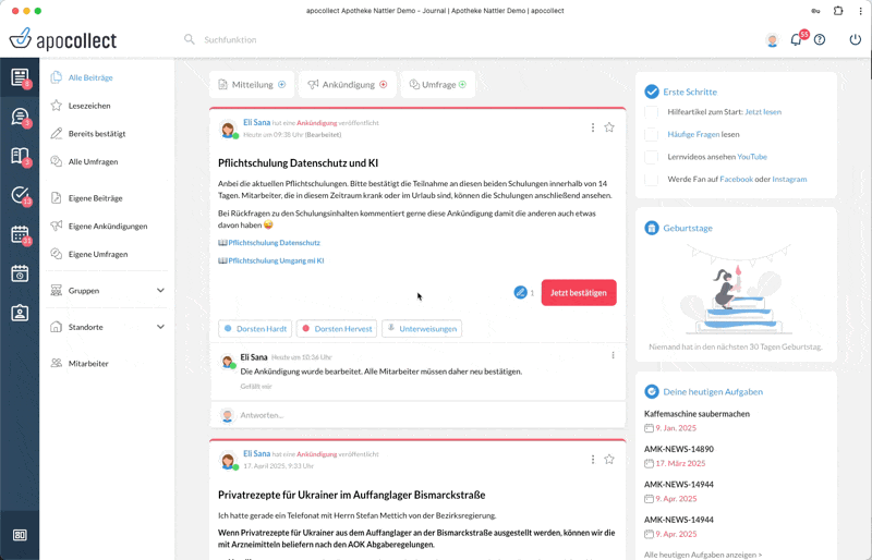 In Journalgruppen wird das Wissen zu einem bestimmten Thema gebündelt oder ihr könnt in Arbeitsgruppen zusammenarbeiten. Wenn Du die Gruppe nicht erstellt hast, muss dich der jeweilige Gruppenadmin zunächst in die Gruppe einladen, damit Du auf die Inhalte zugreifen kannst.
