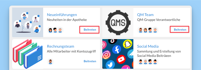 Wenn Du noch nicht zu einer Gruppe eingeladen wurdest, aber gerne auf die Inhalte zugreifen möchtest, musst Du eine Beitrittsanfrage stellen.