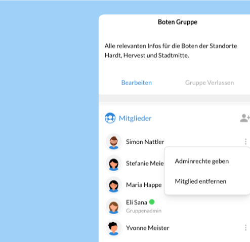 Wenn du einen Gruppenchat erstellt hast, ihn aber nun verlassen möchtest, musst du zunächst einen anderen Gruppenadmin ernennen. Dies machst du ebenfalls in den Chateinstellungen. Gehe hier zum betreffenden Mitarbeiter und wähle "Adminrechte geben".
