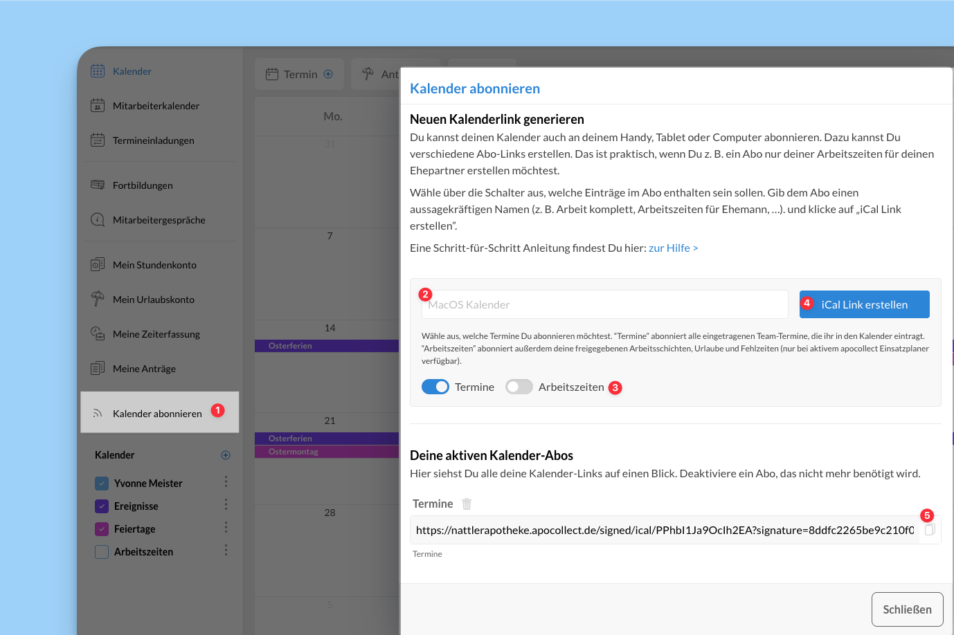 Ihr könnt euch eure Termine und Arbeitszeiten aus dem apocollect-Kalender auch direkt in euren privaten Kalender am Handy oder Tablet abonnieren. Der Vorteil: Ihr seht eure Arbeitstermine direkt dort, wo ihr auch eure privaten Termine plant und braucht nicht zwischen eurem privaten Kalender und dem Apothekenkalender zu wechseln.