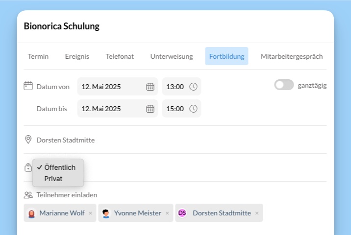 Bei einem Termin kann eingestellt werden, ob die Termindetails auch von unbeteiligten Mitarbeitern einsehbar sein sollen.