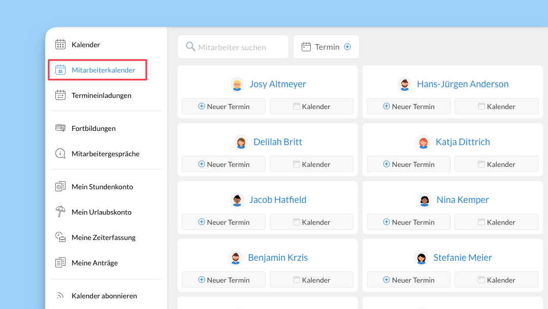 In der Seitenleiste findet ihr am Computer den Eintrag Mitarbeiterkalender. Wenn ihr diesen Menüpunkt anklickt, seht ihr alle Mitarbeiter eures Teams in der Übersicht.