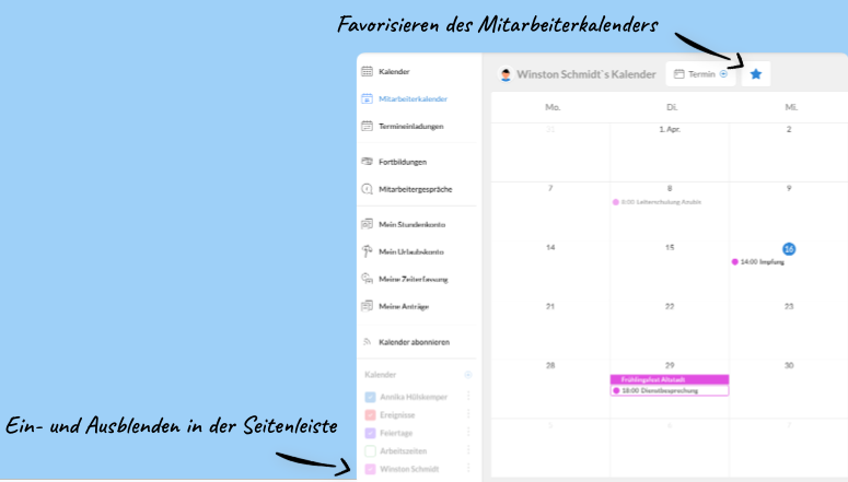 Die Termine des favorisierten Mitarbeiters werden dann direkt in eurem eigenen Kalender angezeigt, allerdings in einer anderen Farbe.