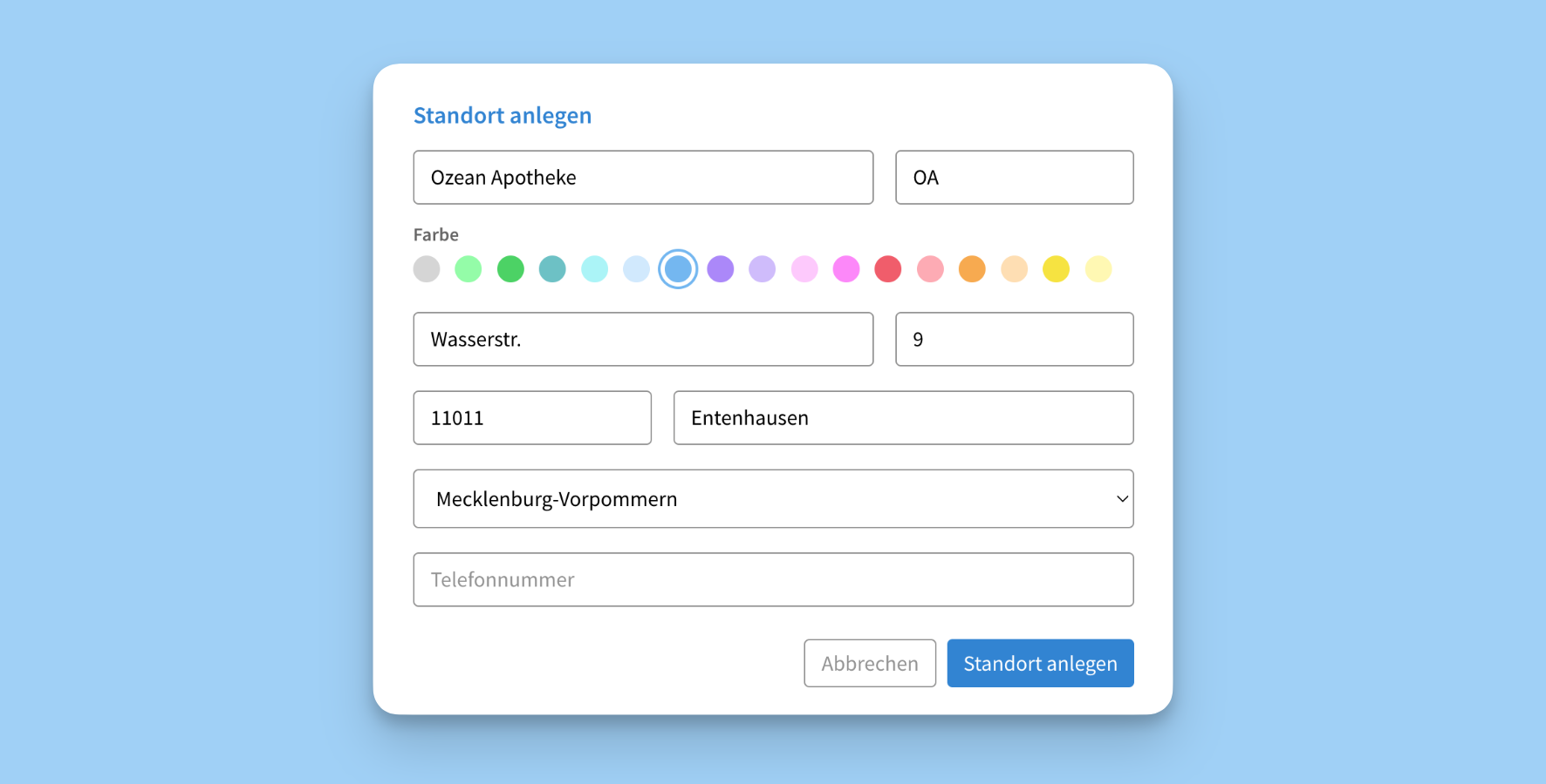 In einem Filialverbund wird für jede Apotheke ein eigener Standort angelegt. Jede Apothekenfiliale erhält eine unterschiedliche Farbe. Dadurch im Plan sofort ersichtlich, wo ein Mitarbeiter gerade eingeplant ist.