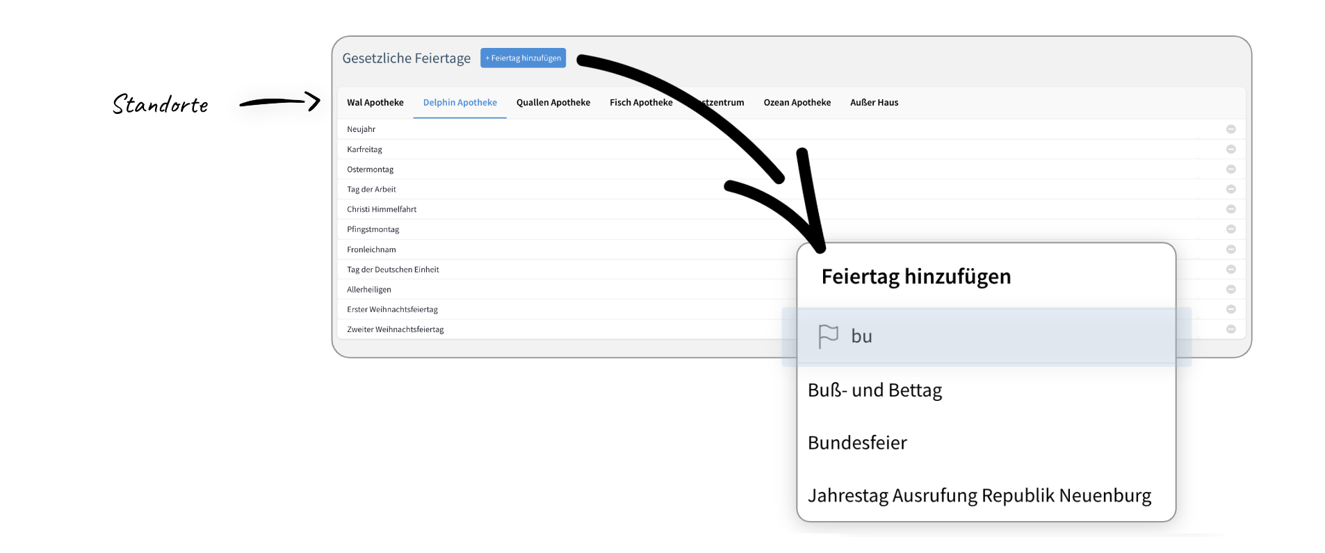 Wenn es in eurer Stadt/Region einen speziellen Feiertag gibt, der nicht für das ganze Bundesland gilt, könnt ihr diesen Feiertag für den Standort hinterlegen.