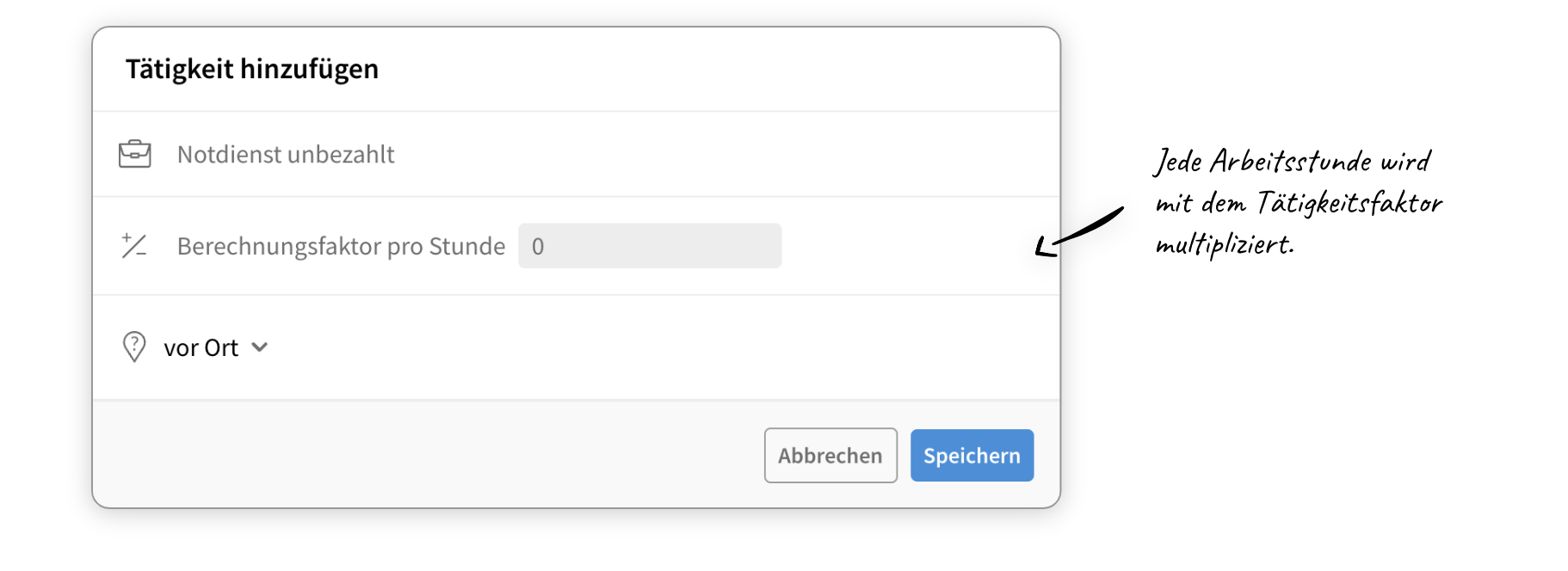 Faktor 0: Der Apotheker erhält monatlich eine Pauschale für die geleisteten Notdienste. Dafür bekommt er keine Überstunden gutgeschrieben. Ihr weist ihm daher die Tätigkeit Notdienst unbezahlt zu mit dem Faktor 0.