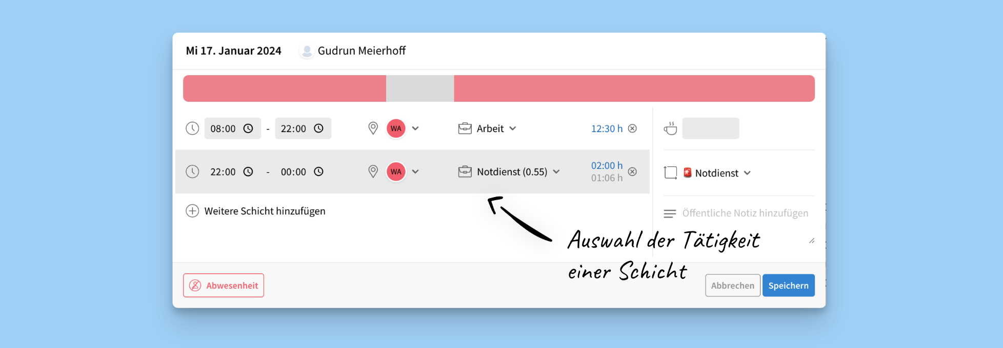 Beim Bearbeiten der jeweiligen Schicht findet ihr ein Dropdown-Menü. Die Standard-Tätigkeit ist Arbeit. Dies ist vorausgefüllt, falls ihr nichts anderes hinterlegt.