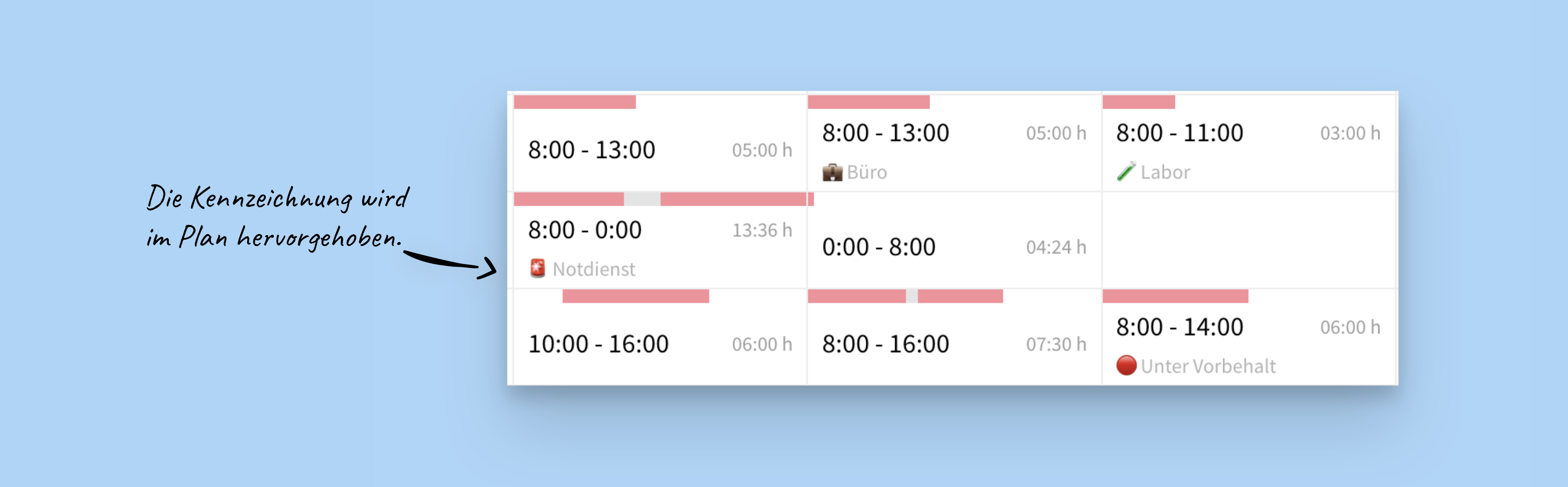 Über die Kennzeichnungen könnt ihr Arbeitsschichten genauer hervorheben.