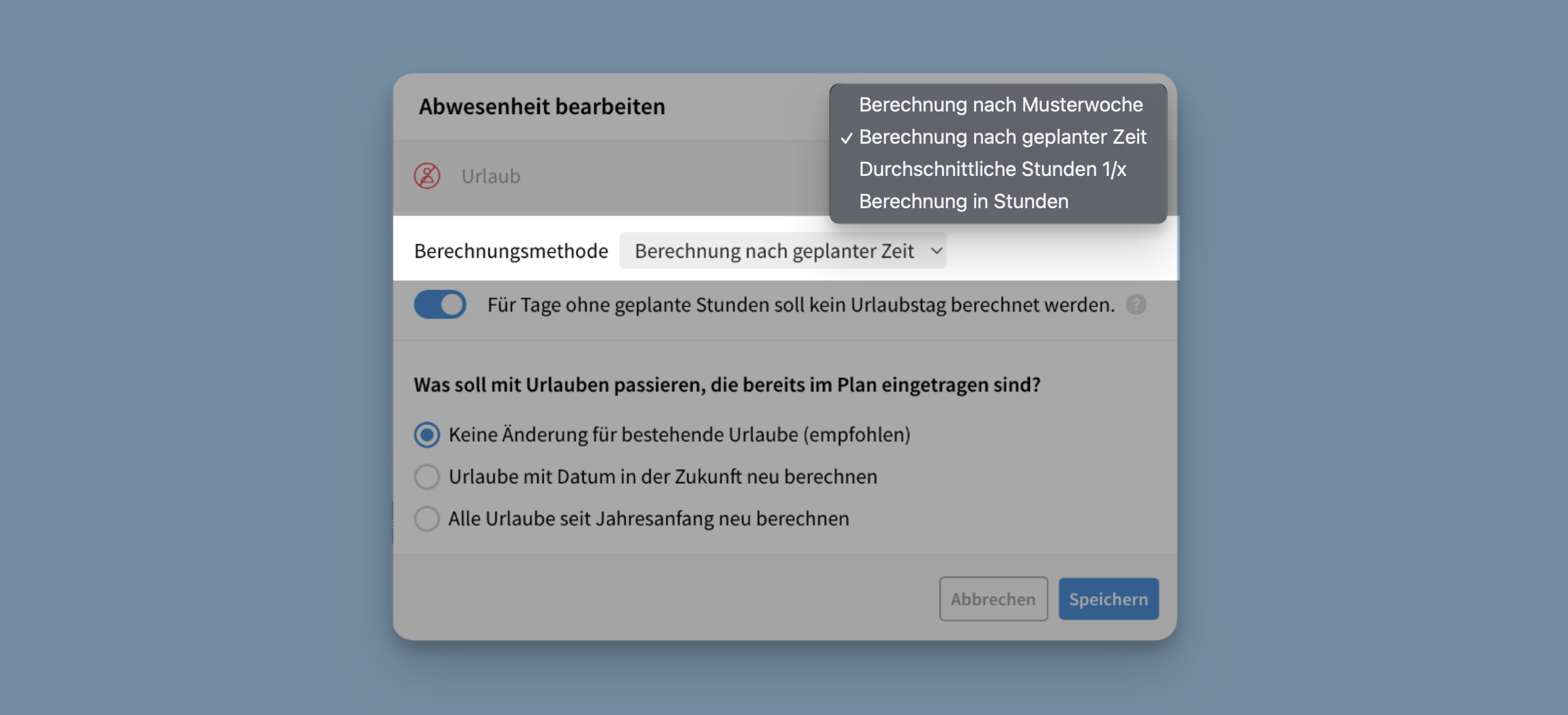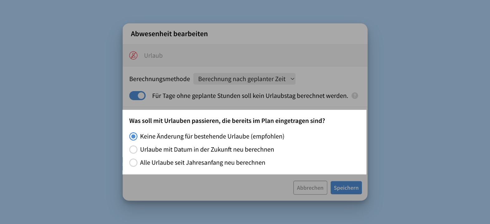 Keine Änderung für bestehende Urlaube | Nur Urlaube, die ihr ab jetzt eintragt, werden mit der gewählten Methode berechnet |