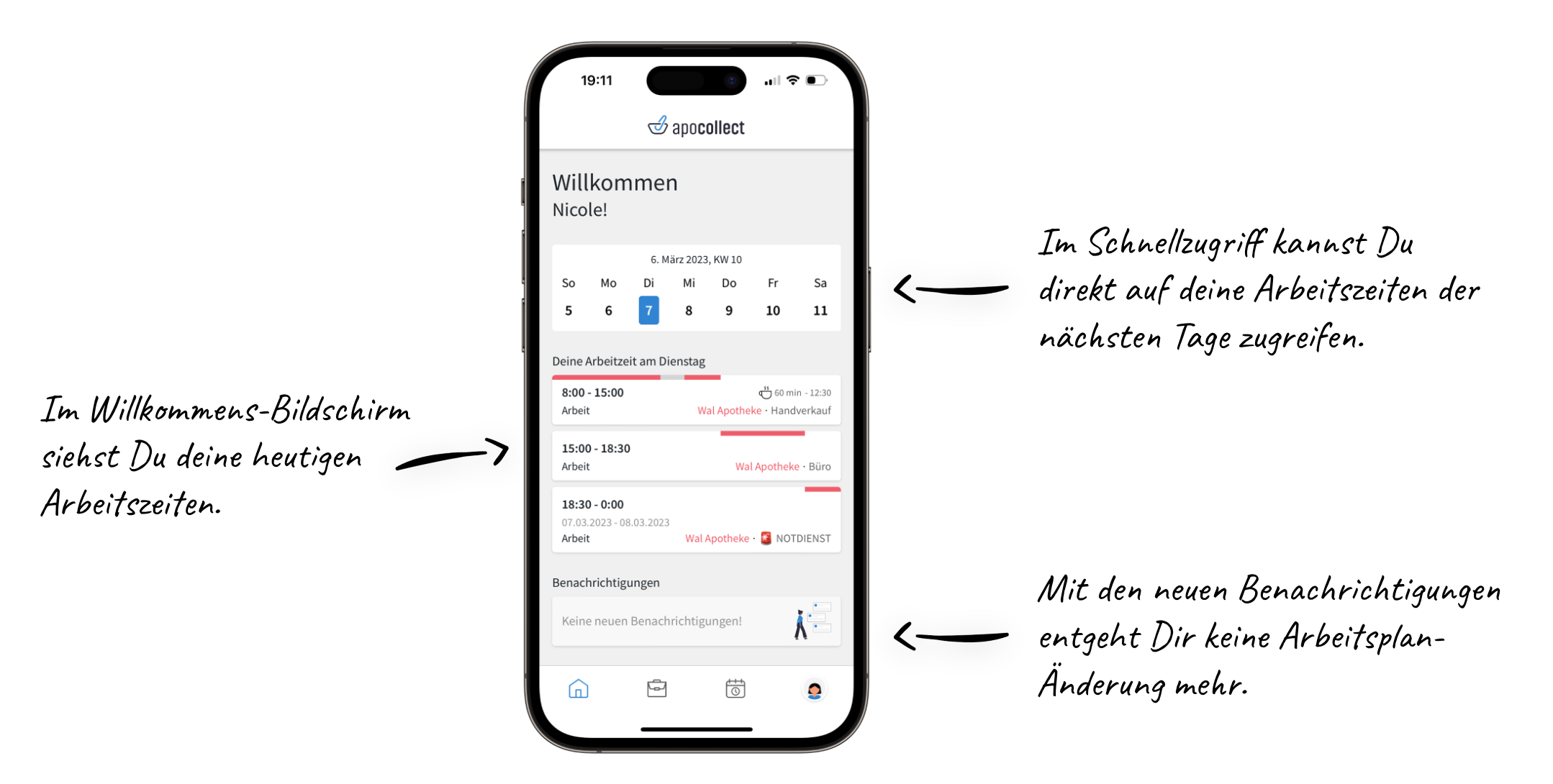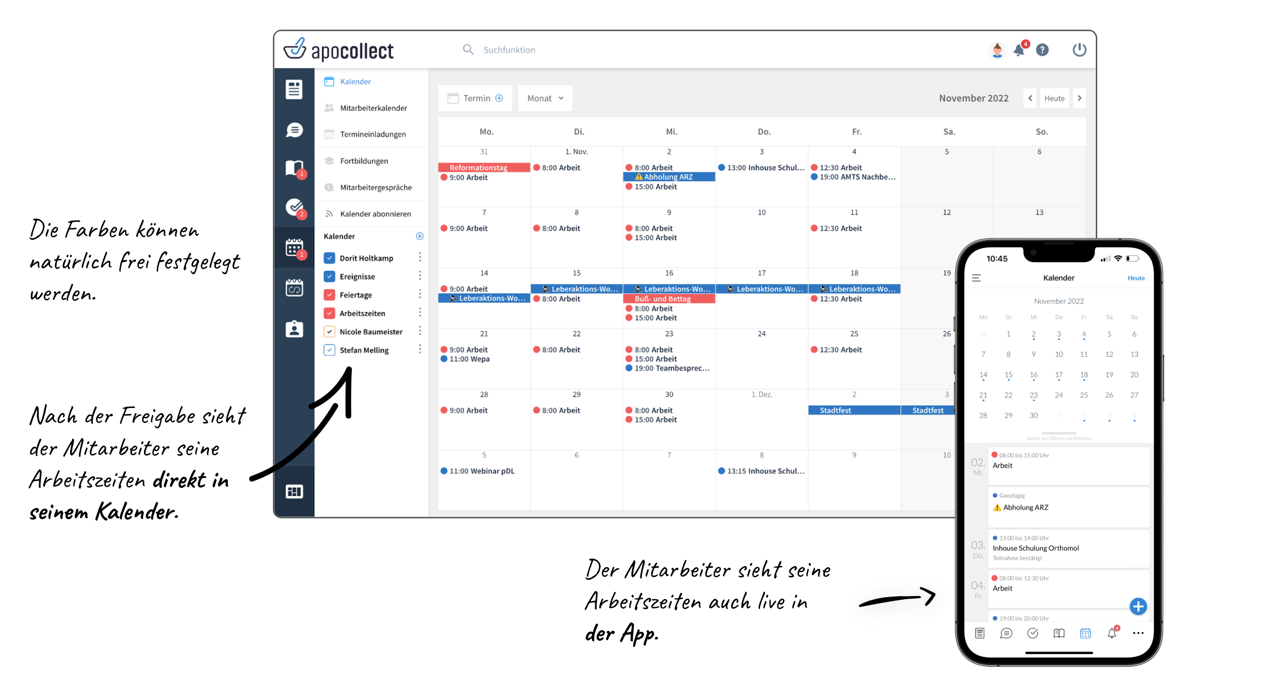💡 Wenn ihr die apocollect 360 Vollversion nutzt, seht ihr eure Arbeitszeiten auch im Kalender der blauen apocollect App, zusammen mit den anderen Apothekenterminen, z. B. Besprechungen oder Fortbildungen.