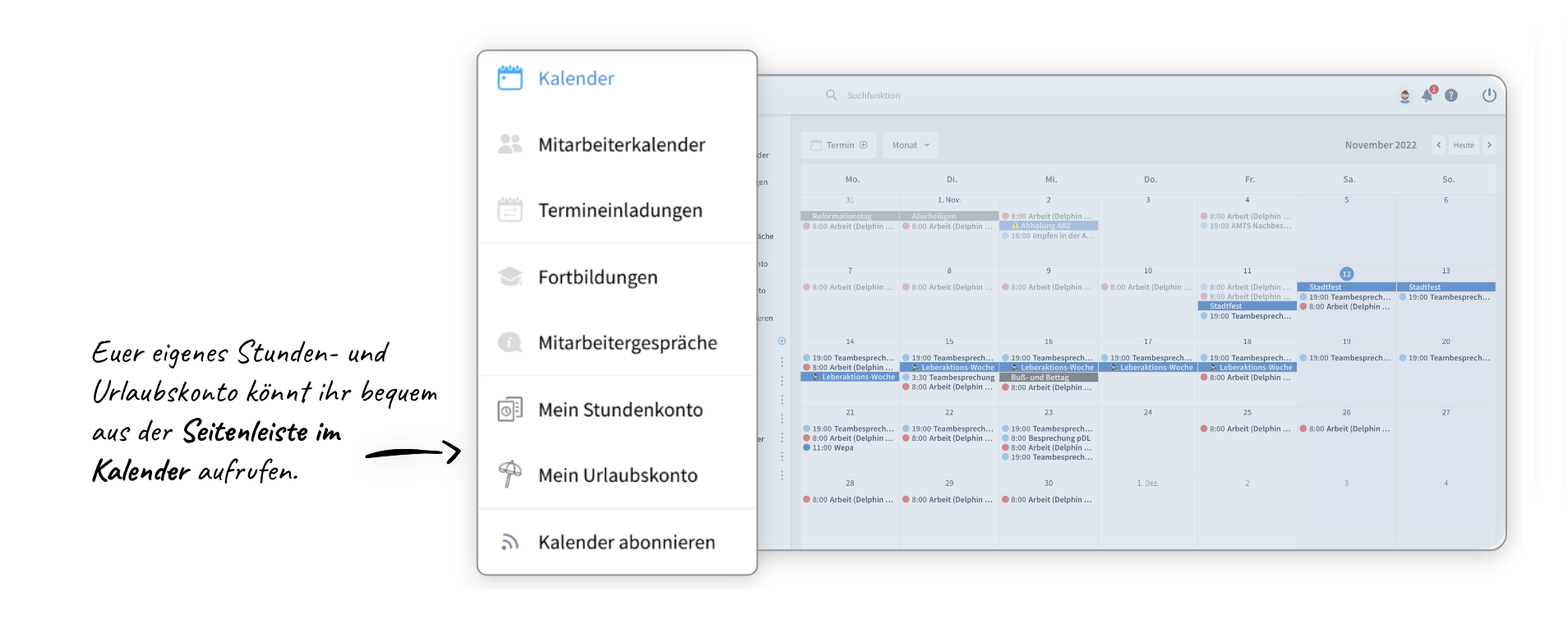 Ihr könnt euer eigenes Urlaubs- und Stundenkonto aufrufen, in dem ihr in der linken Menüleiste den entsprechenden Eintrag auswählt.