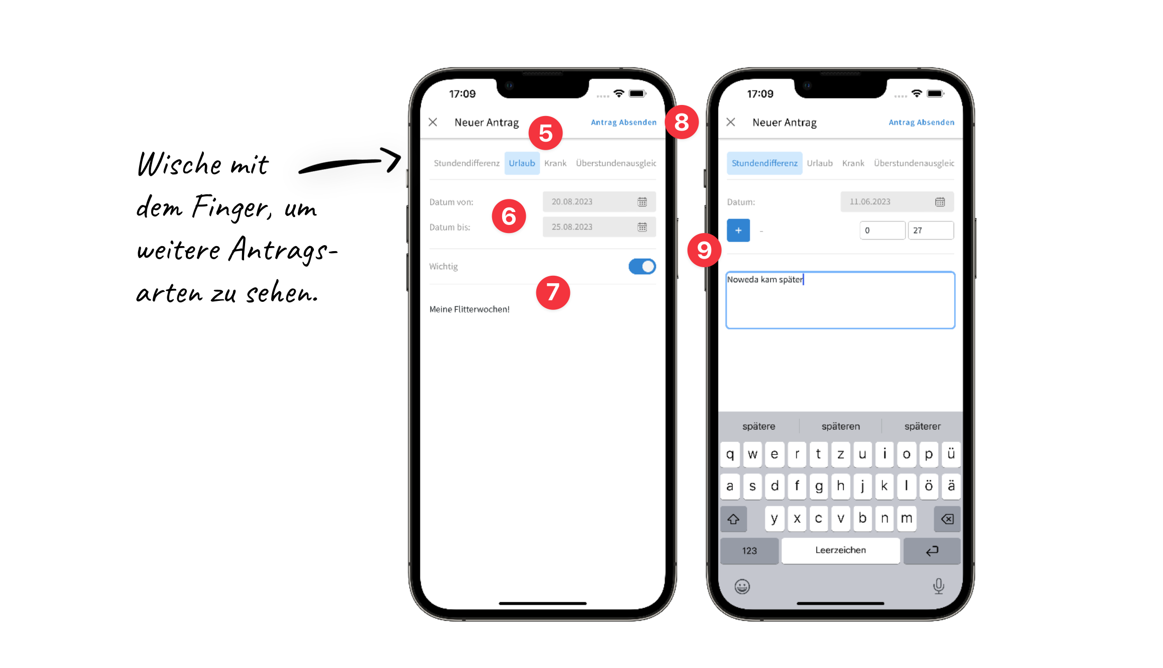 Wähle als erstes die Art des Antrages aus, z. B. Urlaubsantrag (5). Wische mit dem Finger zur Seite, um weitere Antragsarten zu sehen.
