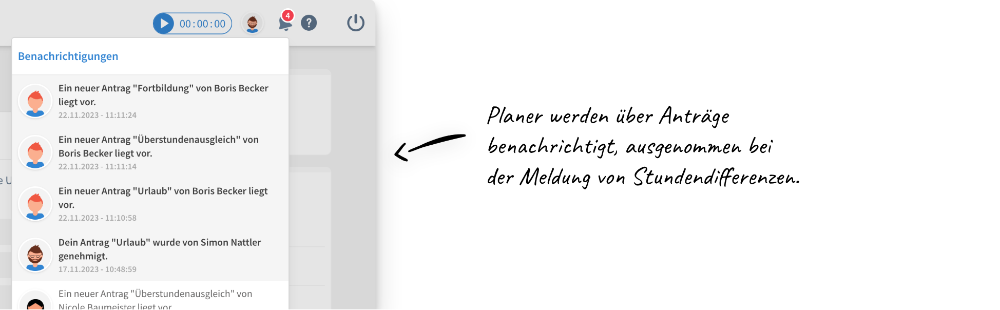 *Bei der Meldung von Stundendifferenzen (z. B. geleisteten Überstunden) erhalten die Planer keine Benachrichtigung. Diese Meldungen sind nicht zeitkritisch und kommen im Alltag recht häufig vor. Die Benachrichtigungen würden daher sehr schnell überhand nehmen und stören.
