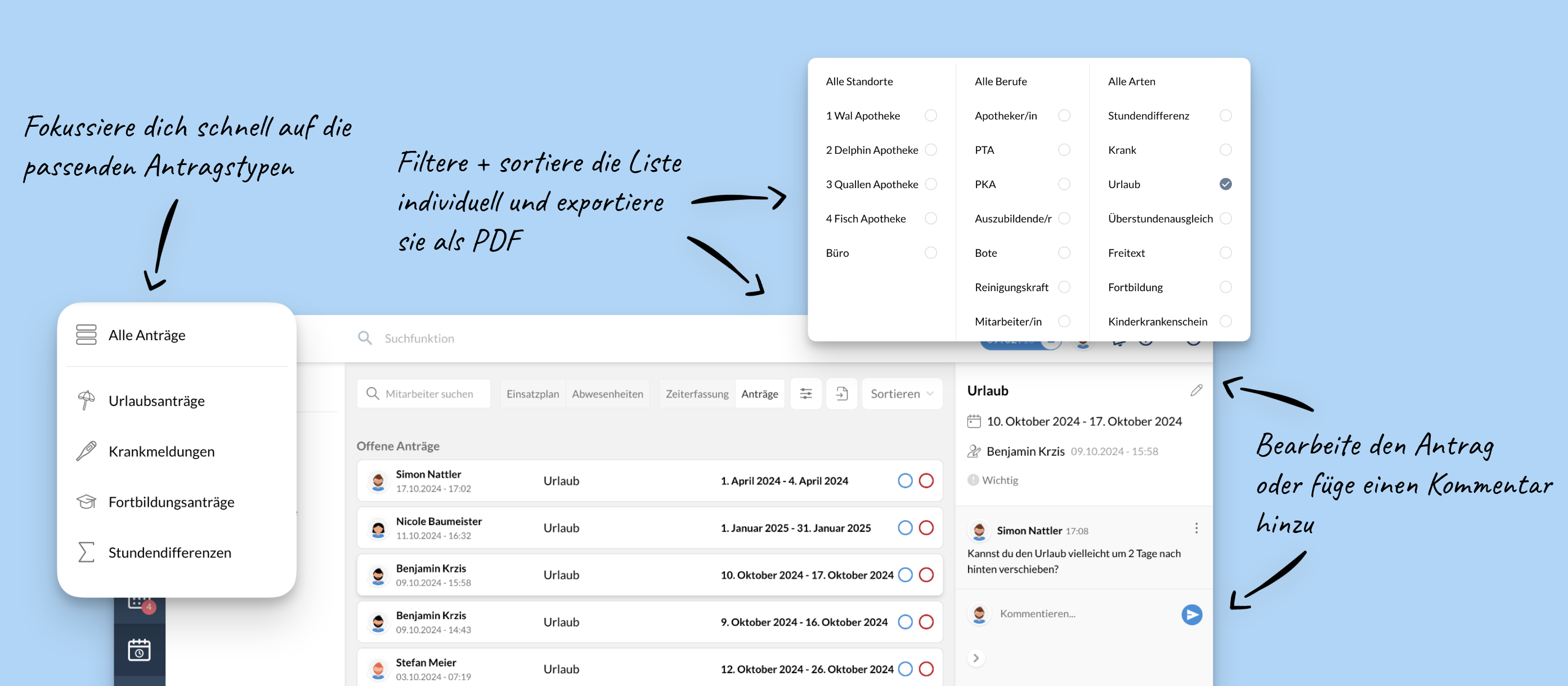 Über die linke Seitenleiste kannst du die Liste auf Anträge eines Typs filtern, z. B. Urlaubsanträge.