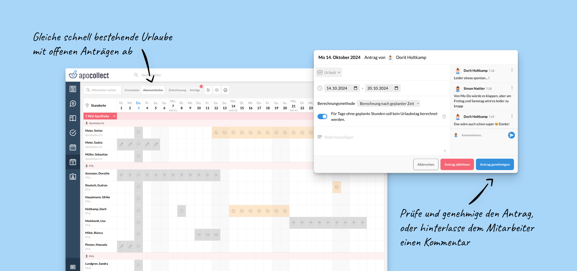 In der Abwesenheitsansicht werden euch die Anträge grafisch angezeigt. Dadurch könnt ihr die offenen Anträge direkt mit den bestehenden Urlauben abgleichen, den Zeitraum anpassen oder auch einen Kommentar zum Antrag hinterlassen.