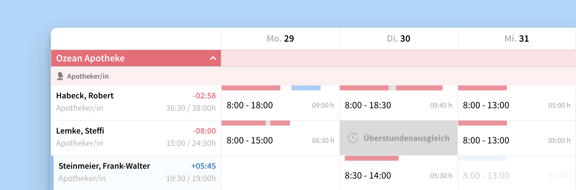 Mitarbeiter in der Apotheke sind typischerweise für eine feste Wochenstundenanzahl eingestellt (Beispiel: 39 Stunden pro Woche) und werden für diese Stundenanzahl auch bezahlt. Dies ist die vertragliche Sollzeit, die der Mitarbeiter jede Woche arbeiten muss.