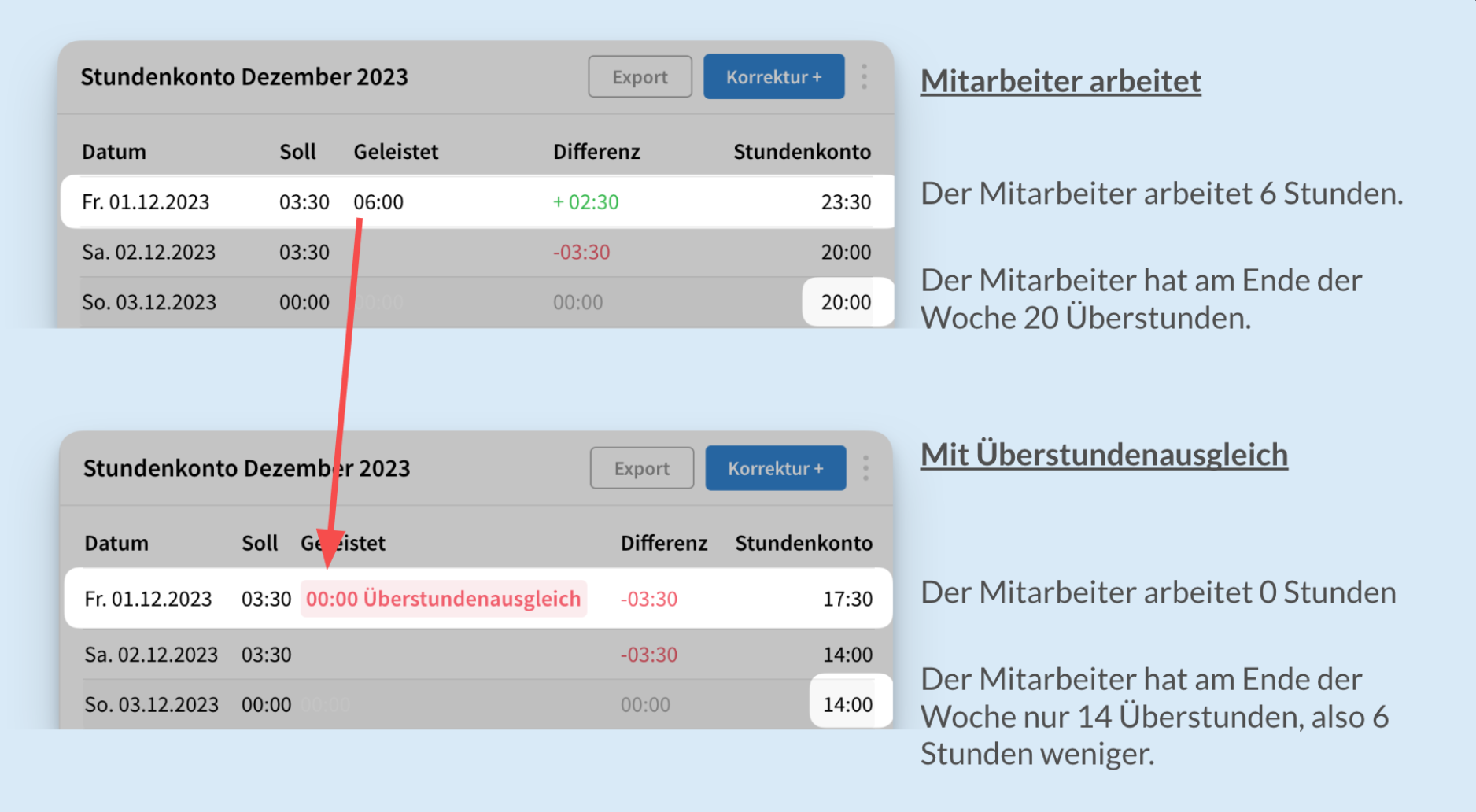 Tragt ihr dem Mitarbeiter nun einen Überstundenausgleich ein, wird die geleistete Zeit für ihn an diesem Tag auf 0 Stunden reduziert (weniger als 0 Stunden kann er ja nicht arbeiten).