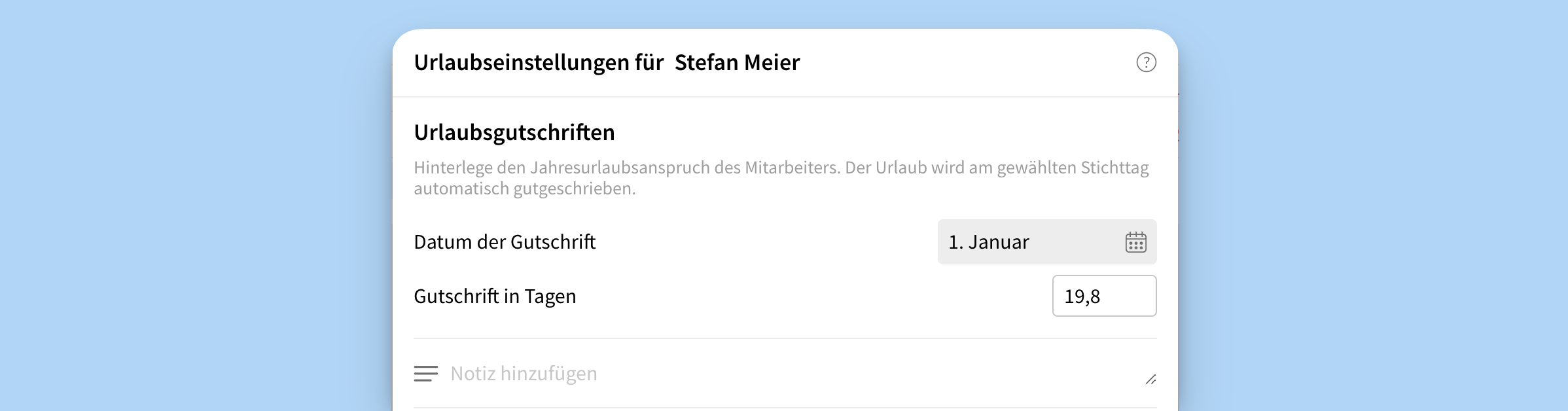 Wer nicht runden möchte, kann bei apocollect im Urlaubskonto > Urlaubseinstellungen für den Mitarbeiter den Urlaubsanspruch inkl. Kommazahl hinterlegen, also z. B. 19,8 Urlaubstage. apocollect schreibt dem Mitarbeiter dann jährlich automatisch seinen Urlaubsanspruch gut, und zwar