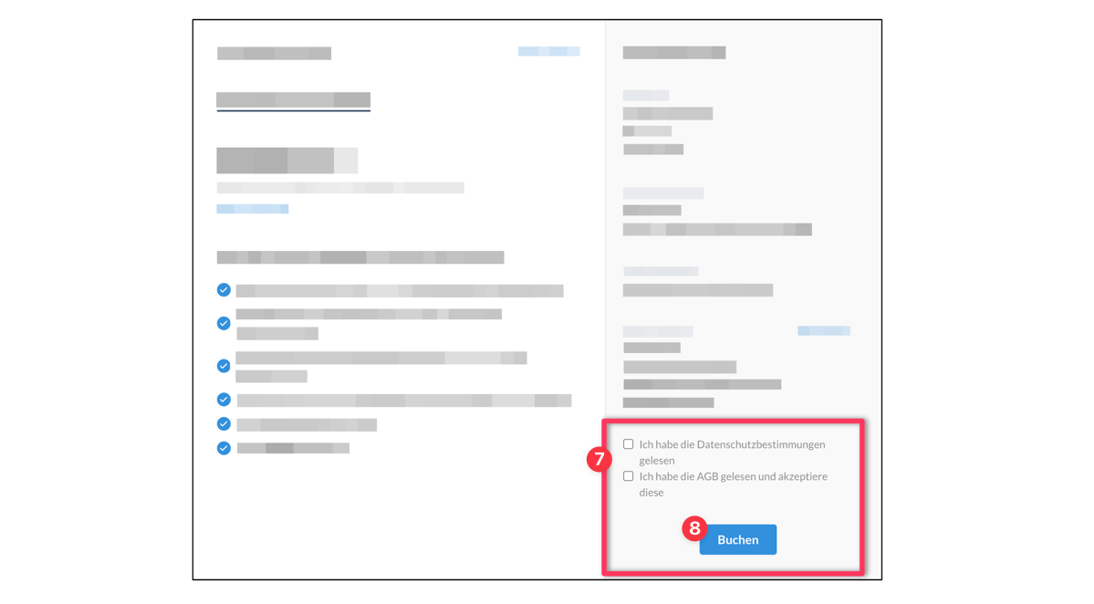 Wenn alles stimmt, akzeptiere die beiden Datenschutz- und AGB-Kästchen (7) und klicke auf Buchen (8).